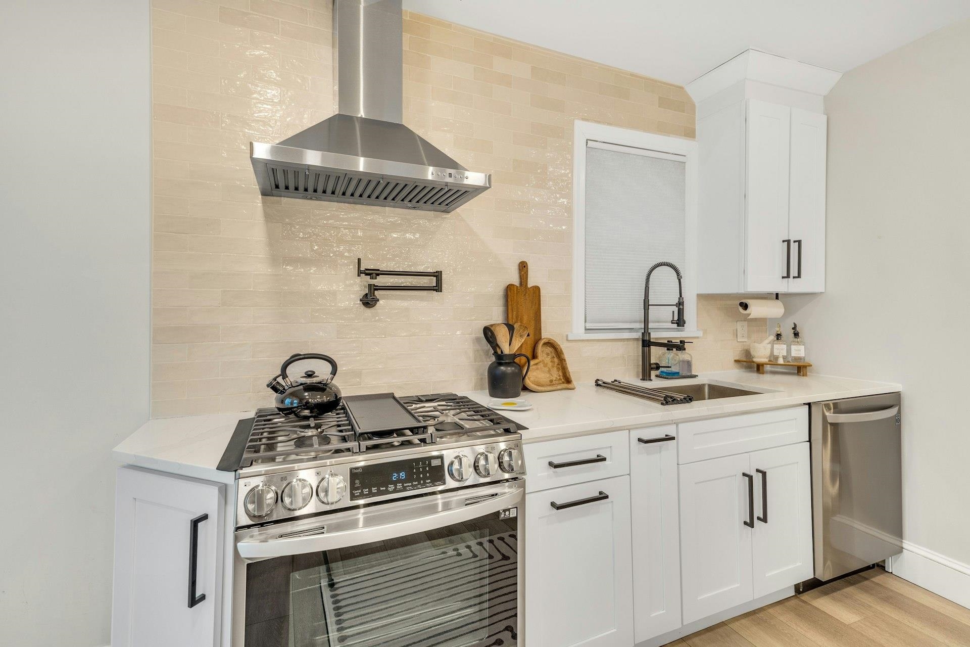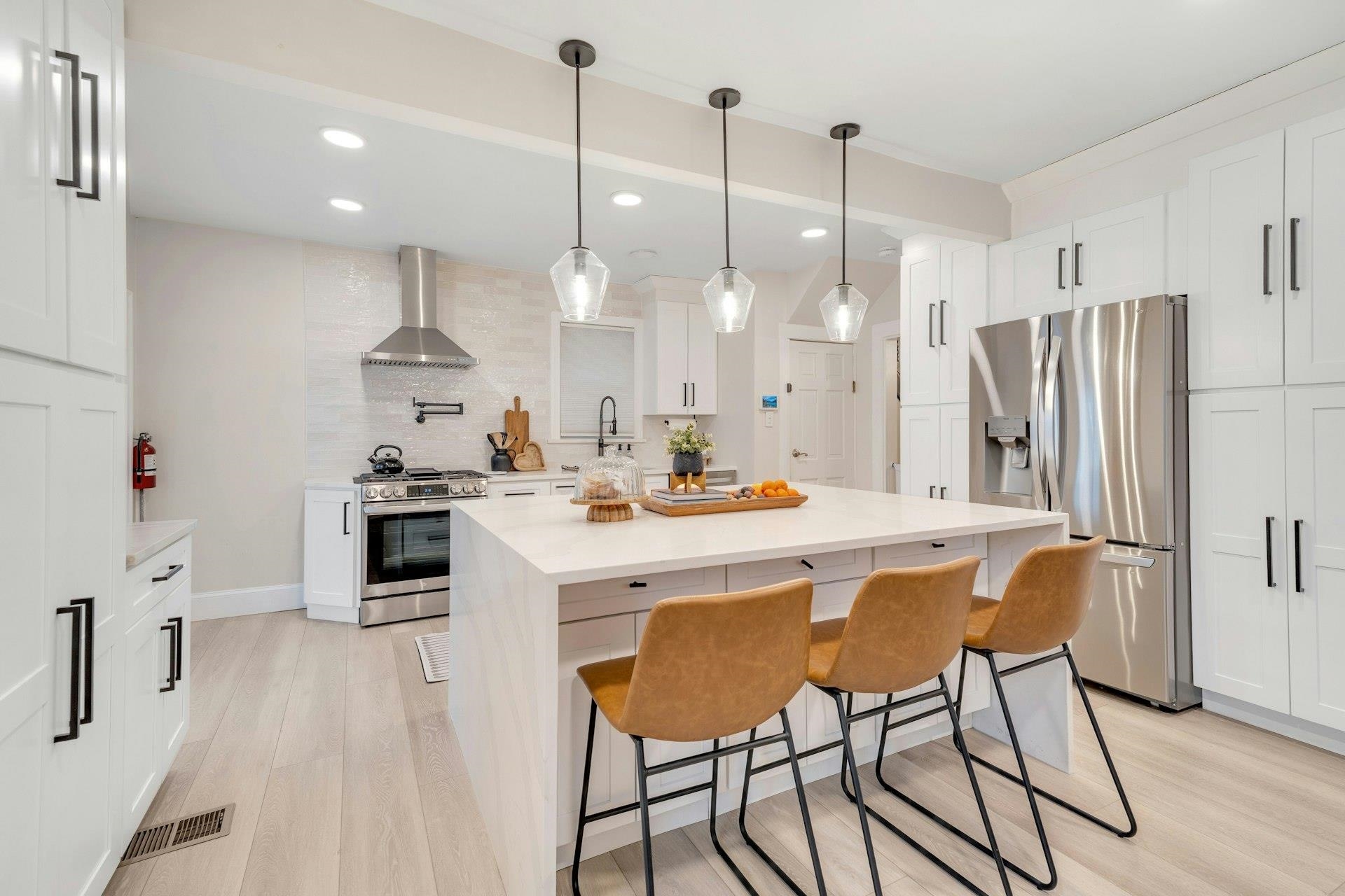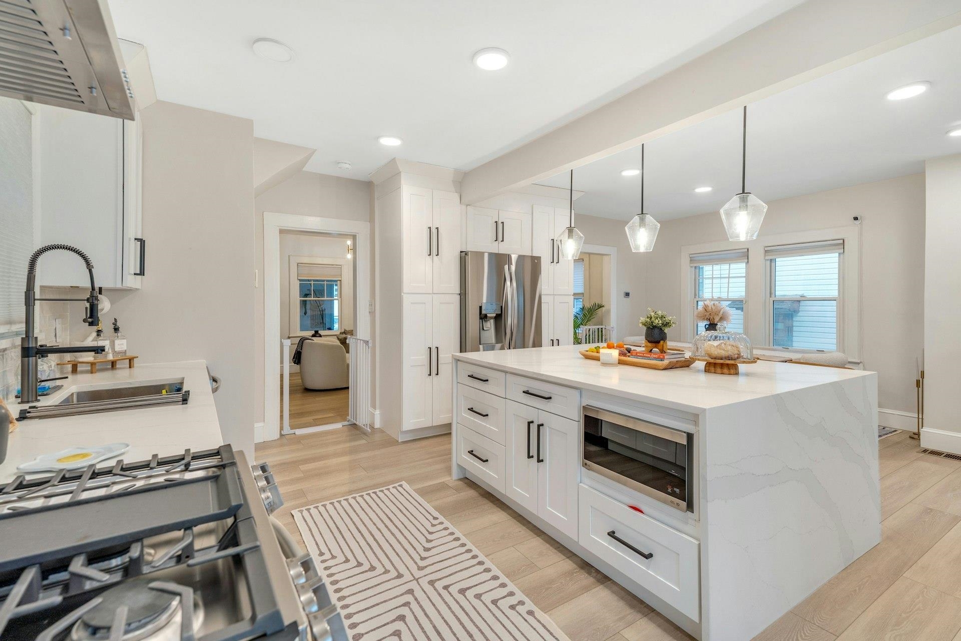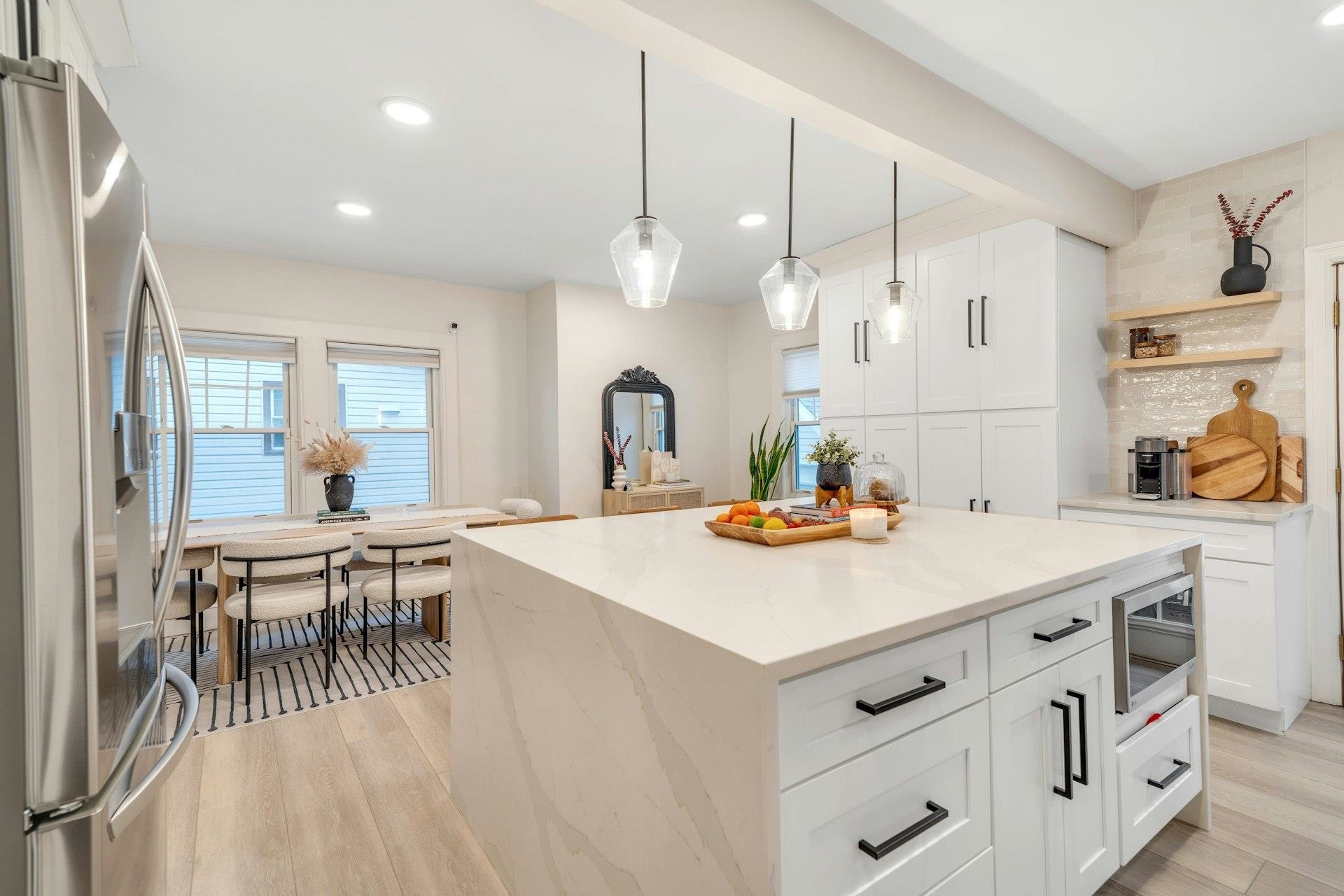Sophisticated and sun-filled, this beautifully updated 4-bedroom, 2-bath home in Kearny’s Manor section lives like a luxury single-family retreat. The main level showcases a stunning new kitchen with sleek cabinetry, stone countertops, premium stainless steel appliances, and an open flow to the dining and living areas—perfect for stylish entertaining and everyday ease. Two spa-like full bathrooms feature modern finishes and clean, contemporary design, while the upper levels offer generously sized bedrooms, including a top-floor retreat with a walk-in closet that feels like a private dressing suite. Outside, enjoy a neatly manicured yard and a garage for secure parking and extra storage, all moments from parks, shops, and convenient commuter options to Jersey City and NYC.