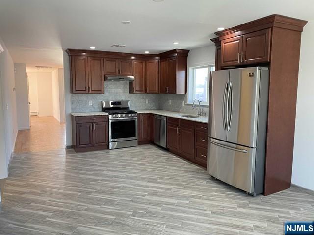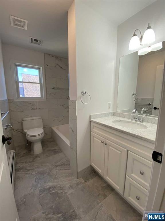 Spacious new construction 3 bedroom, 2 full bath second floor apartment. An open floor plan with living room, dining area and large, modern eat-it kitchen, granite counters, tile back splash and dishwasher. Features a master bedroom with master bath, laundry in unit with washer/dryer provided, recessed lights, hardwood and tile flooring throughout, baseboard hot water heat, central air condition. No pets of any breed. Super convenient location, just a block away from train station for easy commute to NYC.