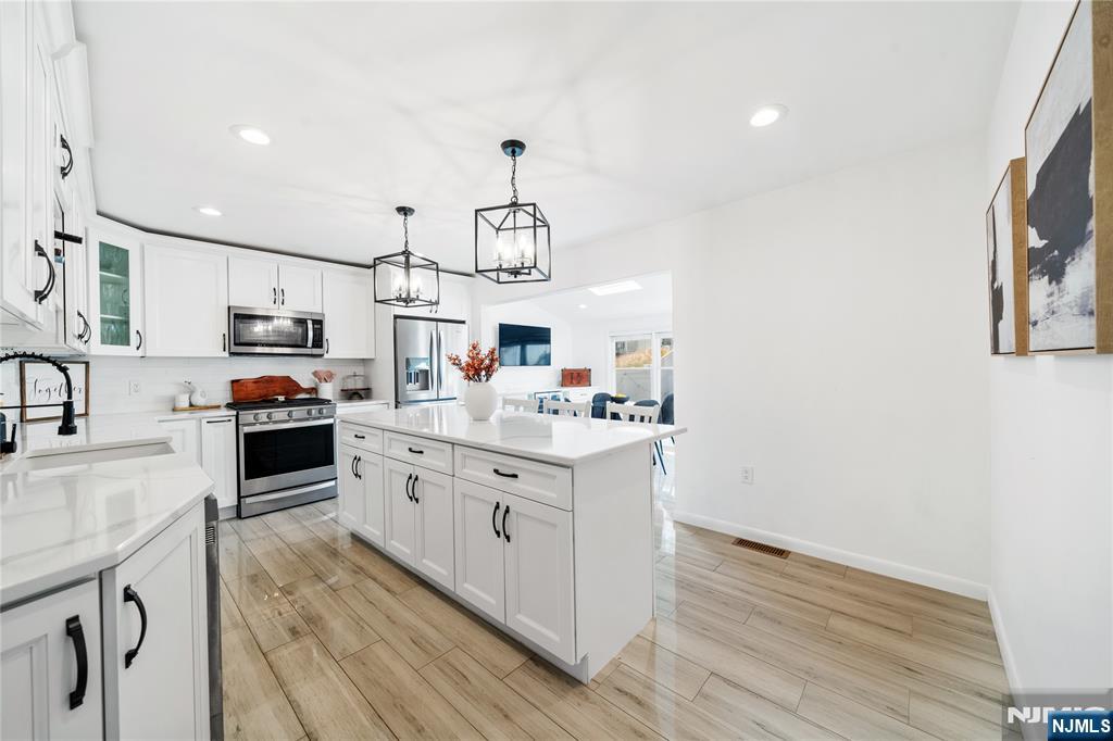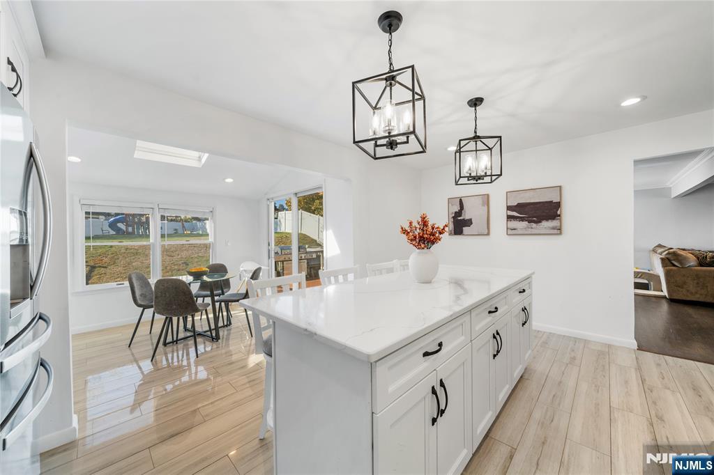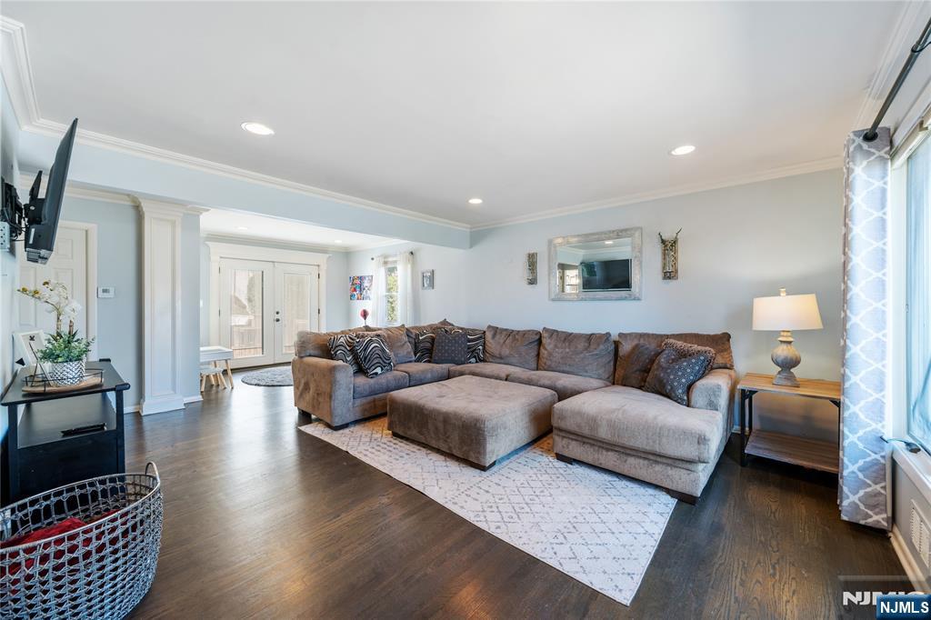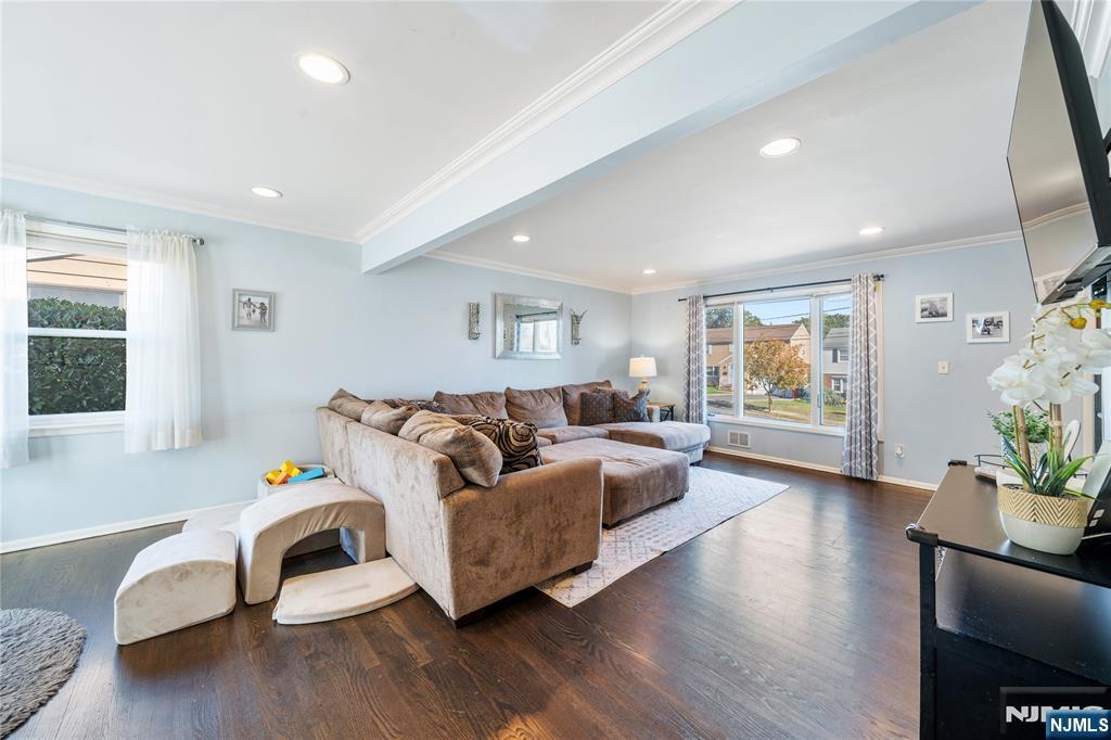 Welcome to this beautifully detailed home nestled on a quiet residential street near a highly rated elementary school. Set on an oversized lot, this property offers incredible space inside and out. Step into a large living room with powder room that has walkout to the back deck. Adjacent formal dining room has custom gas fireplace. Each room is enhanced by elegant crown molding and timeless design touches. The updated kitchen impresses with bright white cabinetry, a large island with seating, and a separate dining nook overlooking the expansive backyard. Upstairs, the primary suite features high ceilings, a walk-in closet, and a private bath, while two additional bedrooms share their own bathroom. The finished basement adds even more living space with stylish finishes and a convenient half bath that is ideal for a rec room, gym, or play area. Sliding doors lead to a large Trex deck and a huge, fenced-in yard with plenty of green space for entertaining or relaxing. Easy commute to NYC transportation, ON3 campus and major highways. Move right in and enjoy a home that blends thoughtful detail, modern updates, and that perfect suburban lifestyle.