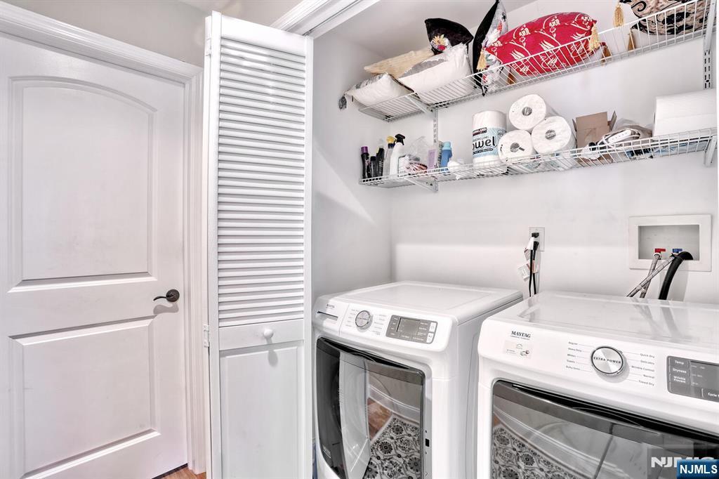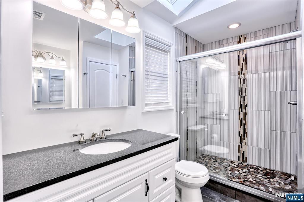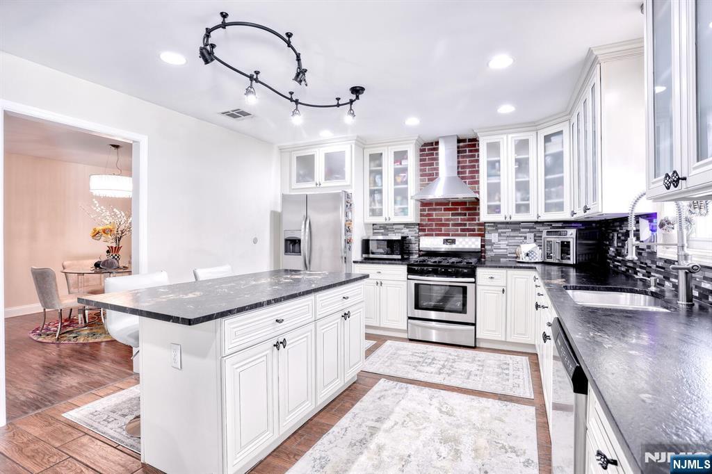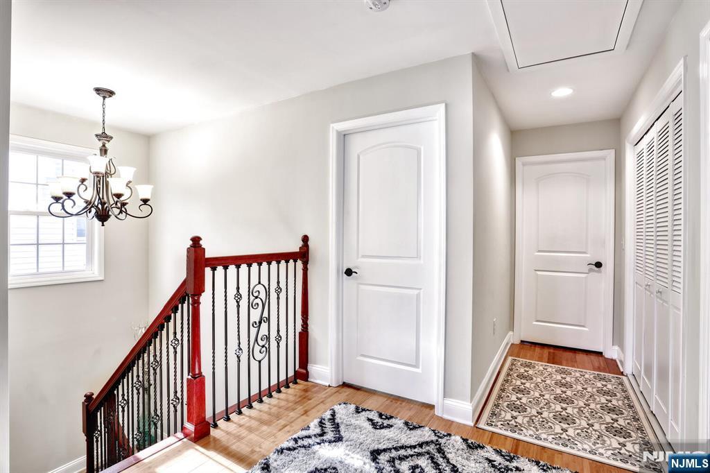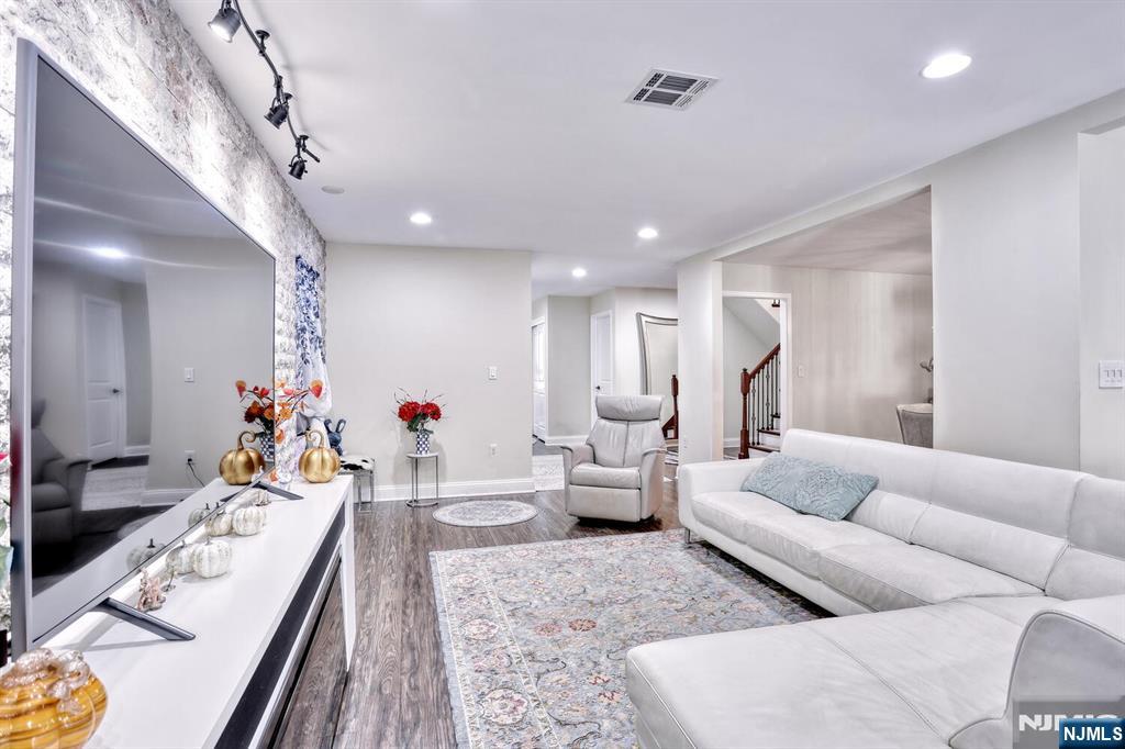 Beautiful 6 year young home built on existing foundation located in North Arlington. Open Floor Plan, spacious home with 5 Bedrooms & 3.1 baths. The first floor welcomes you with an open floor plan. With entry foyer, living room with accent wall, kitchen with central island, formal dining room, bedroom, half bath and door to backyard. The second floor features a large primary bedroom with vaulted lighted ceilings, 2 walk in closets and a large ensuite primary bath with 2 separate sinks & skylight. Second floor also features 3 additional spacious bedrooms, full bath, laundry, multiple linen closets and pull down stairs to attic. Basement is full & finished with an entertainment room, full bath, additional laundry hookups & 1 car garage. Backyard is fully fenced in with jacuzzi tub & sun setter awning. Additional features include: hardwood floors on 1st floor & bamboo flooring on 2nd floor. Plenty of storage, 2 car parking in driveway, 2 zone ac & heating, recessed lighting. Easy commute to NYC with easy access to highways & buses. Close to schools & shopping.