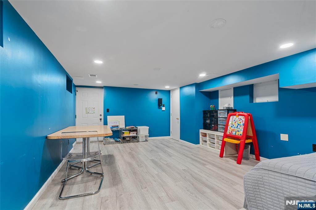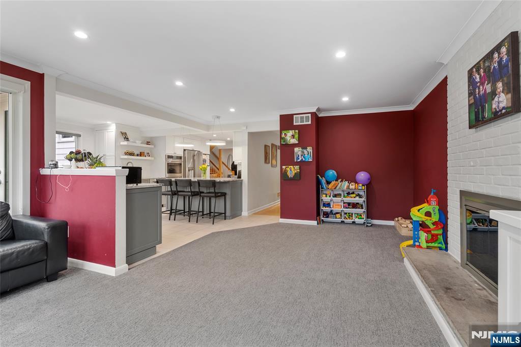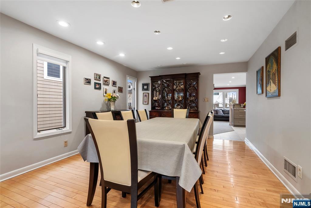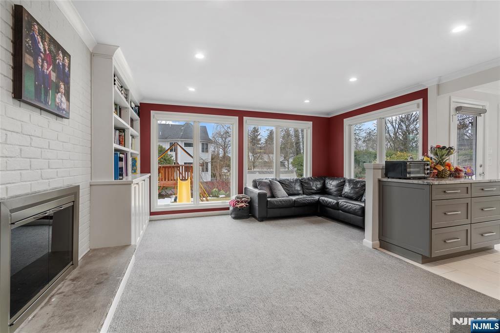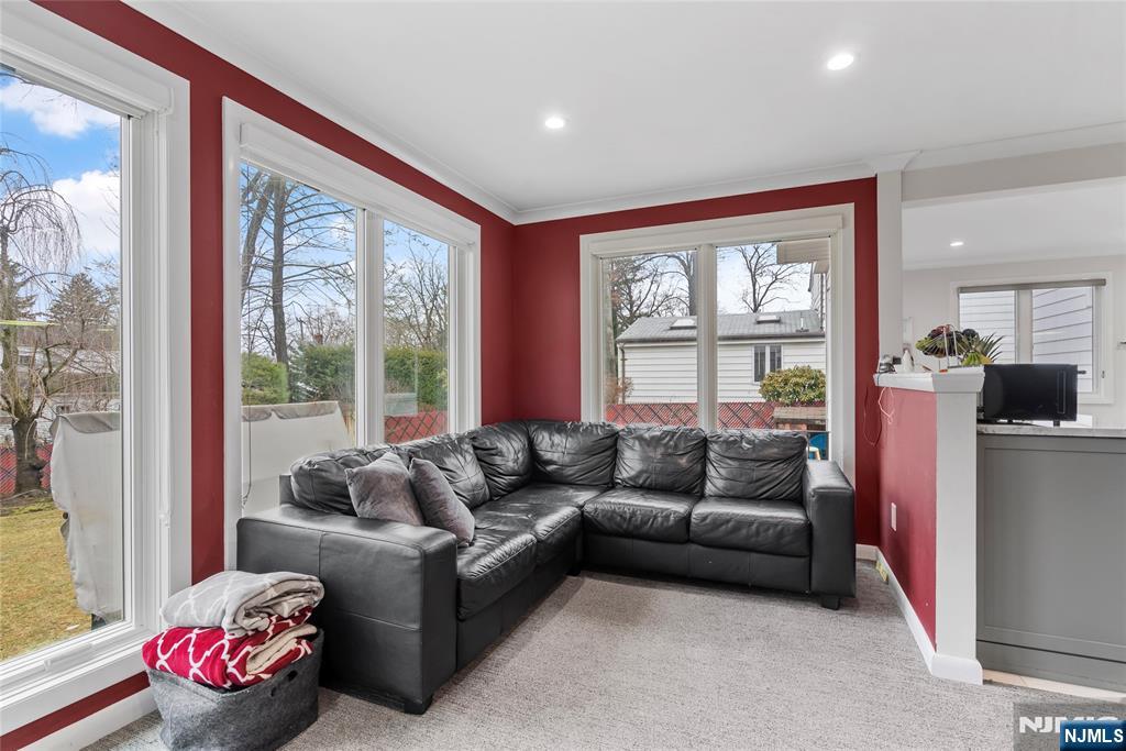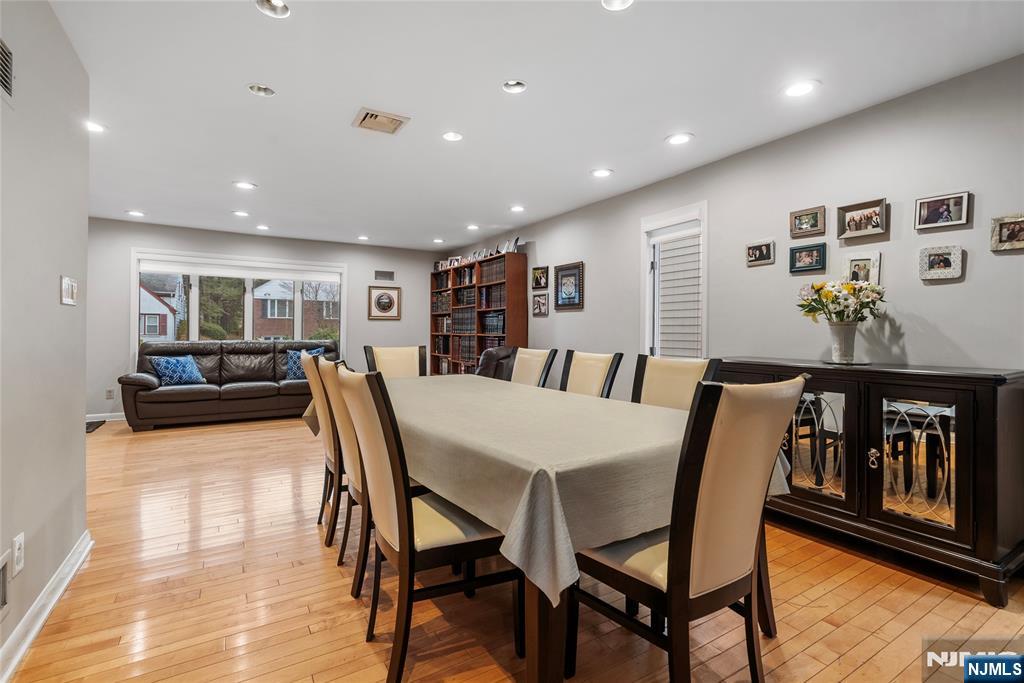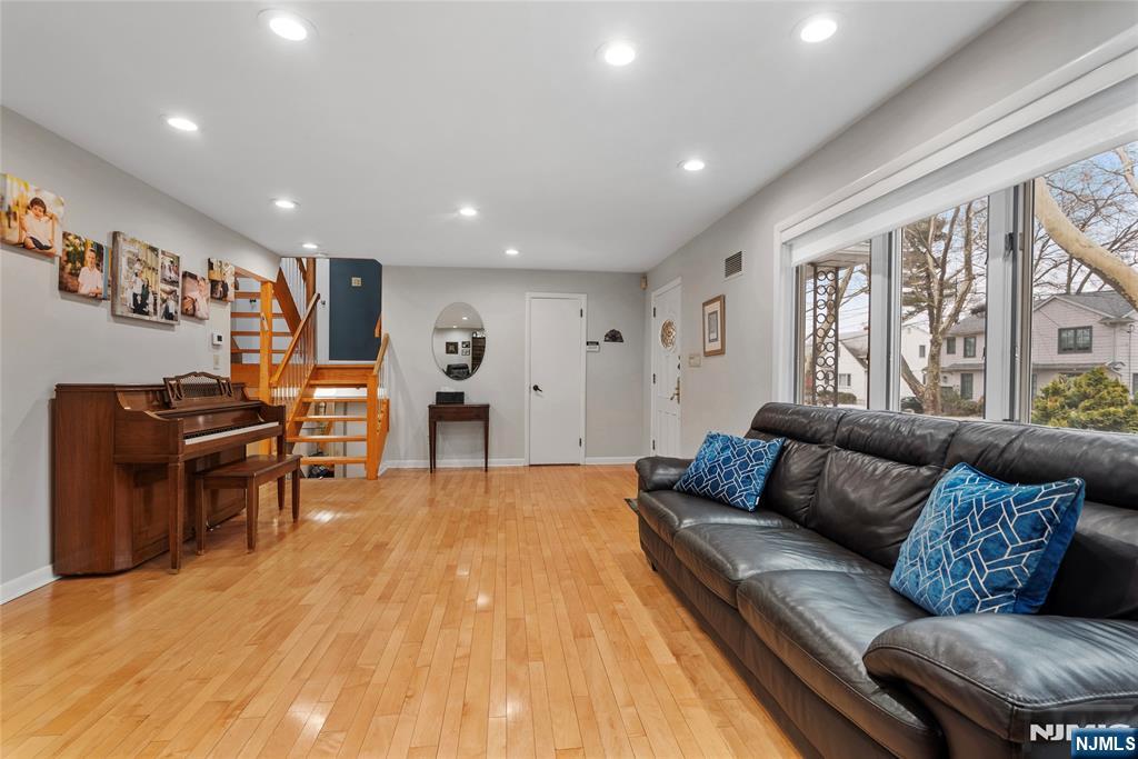 Sun-filled and exceptionally spacious, this beautifully maintained split-level home offers multiple levels of comfortable living, generous room sizes, and wonderful natural light throughout. The main level features a bright living room that flows seamlessly into the dining room, creating an ideal layout for both everyday living. The updated eat-in kitchen includes two ovens, two sinks, two dishwashers, a five-burner stove, and a bright dining area. The family room is filled with natural light from large windows and centers around a classic wood-burning fireplace. Upstairs, the home offers five bedrooms across two levels. The first bedroom level includes two bedrooms and a full bathroom with double sinks. The next level features two generously sized bedrooms and a full bathroom with double sinks and a shower over the tub. Large primary suite with multiple closets and a private bathroom. The lower level provides flexible living space with a mudroom featuring built-in cabinetry, a small office area, and convenient access to both the backyard and garage. The finished basement level offers a spacious recreation room, a powder room, and a private guest suite. This suite has its own entrance to the backyard. Outside, the property features a sprinkler system, and the house is equipped with a Tesla EV charging station for modern convenience. A rare opportunity to own a bright, spacious home with flexible living areas in one of Teaneck’s most desirable neighborhoods.