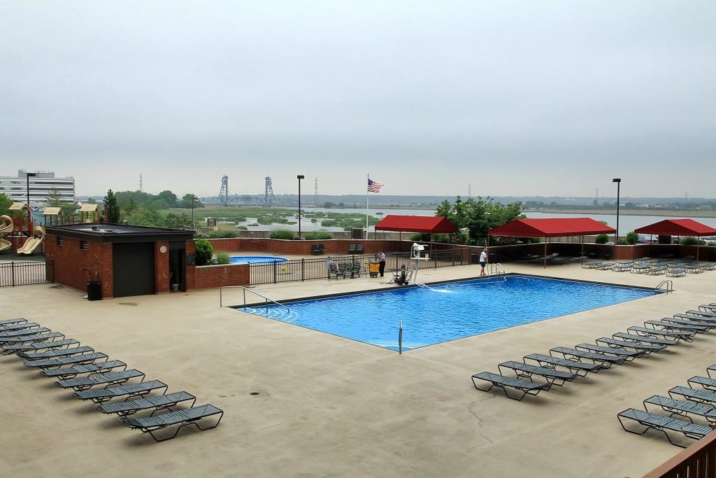Welcome to this attractively renovated 3 BR/2 Bath Simplex offering over 1520 SF of spacious, sun-drenched living! Enjoy beautiful Hackensack River and sunset views from your walk-out terrace overlooking the pool. Located for convenience on the 2nd floor, just steps from the elevator.  Large kitchen, perfect for entertaining with granite countertops, stunning white backsplash, plenty of cabinets, and SS appliances.  Elegant, engineered wood flooring (2020) flows through the living, dining, and hallway. Bedrooms are complete with cozy, newly installed carpet.  Master Suite Features a walk-in closet and a fully renovated Master Bath (2018) with a modern double vanity, standing shower, and your own private Sauna Room!  Large den can serve as a 3rd room or Office incl New HVAC (2019). Modern renovated second bathroom includes a Washer/Dryer closet. One deeded covered parking space incl. Harmon Cove Tower offers a premier lifestyle with unparalleled amenities: 24 Hr Doorman/Concierge, security, huge Swimming Pool/Kid's Pool, Fitness Center, Steam Room, Basketball/Tennis Courts, playground, and game room. Commuter's Dream! Express NJ Transit Bus stops right under the building for an easy NYC commute! Excellent location near Secaucus Junction train station, NJ Turnpike, Rts 3, 1-9 & Newark Airport. This beautifully maintained, spacious home with luxury amenities is a must-see!