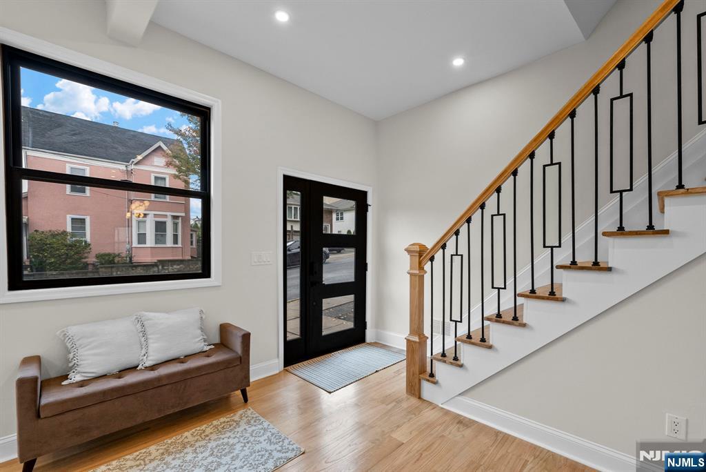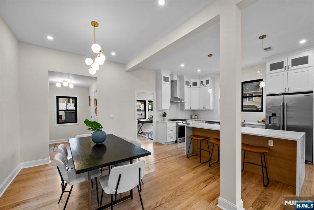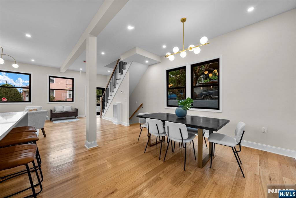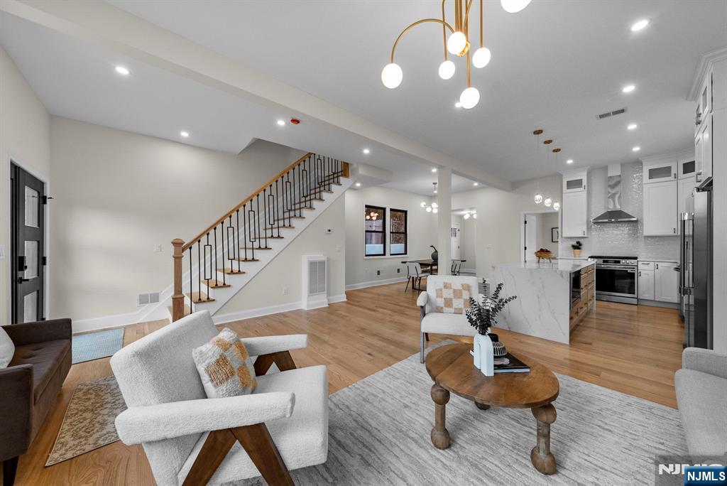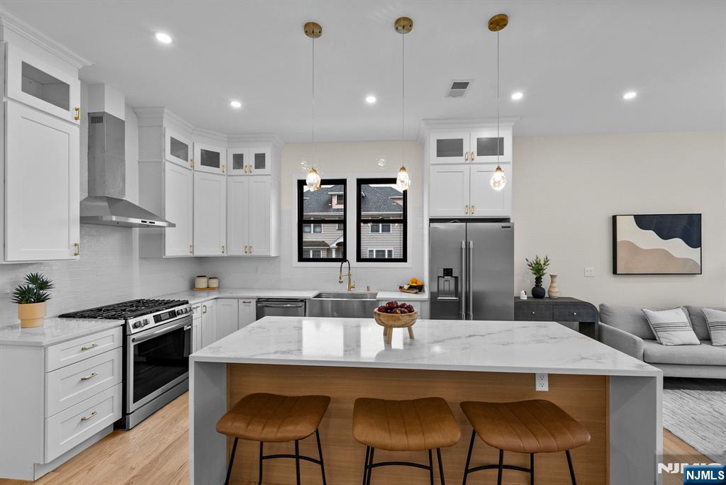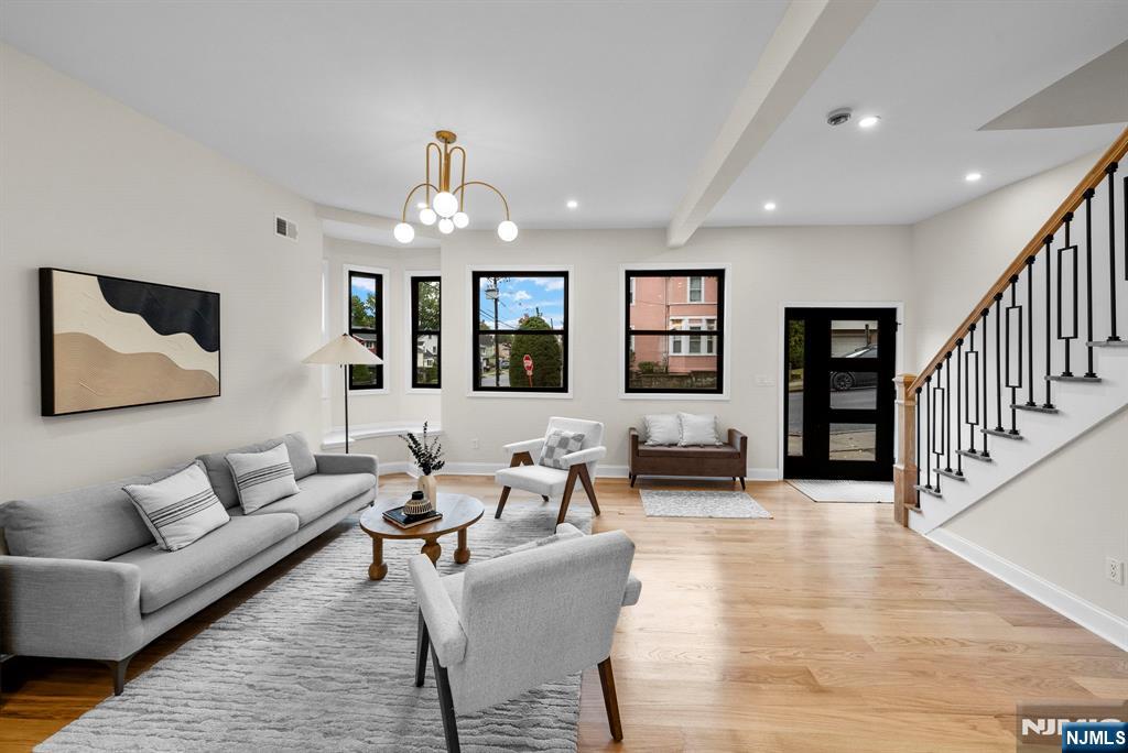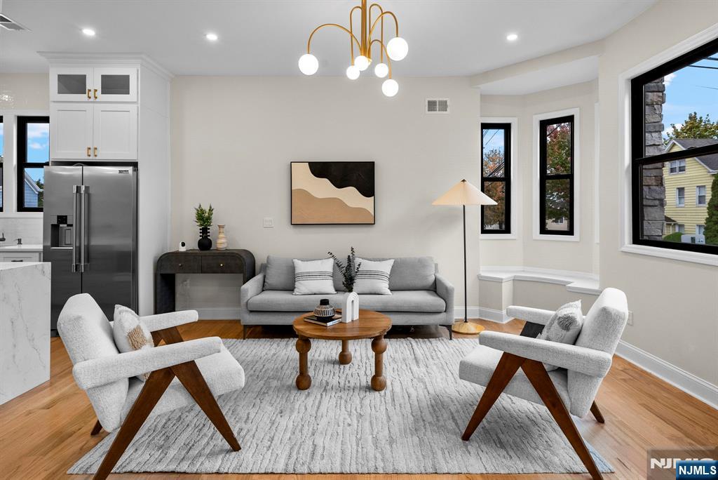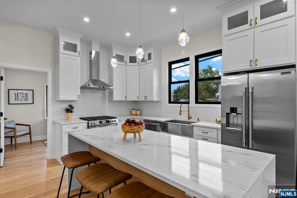 Welcome to 573 Anderson Avenue, Wood-Ridge, where modern design meets skyline views of New York City. This fully rebuilt 5-bedroom, 3.5-bath residence perfectly blends luxury, light, and livability. The open-concept main level invites you in with an elegant flow between the living, dining, and kitchen areas, framed by oversized Andersen windows that flood the home with natural light. At its center, a striking 8-foot island anchors the chef’s kitchen, featuring a full-height designer backsplash, quartz counters, and premium stainless appliances - the ideal space for both gatherings and everyday living. A dedicated office on the main floor adds comfort and function. The second floor offers three spacious bedrooms, including a serene primary suite with a spa-inspired bath and walk-in closet. A second full bathroom completes this level with sophisticated tilework and stone finishes. The third floor expands the home with two additional bedrooms and another full bath, both enhanced by skylights and sweeping views of the Manhattan skyline. Downstairs, the finished basement provides a flexible area ideal for a gym, play room, or media room. Outside, enjoy the private corner lot with an above-ground pool, detached garage, and parking for four.