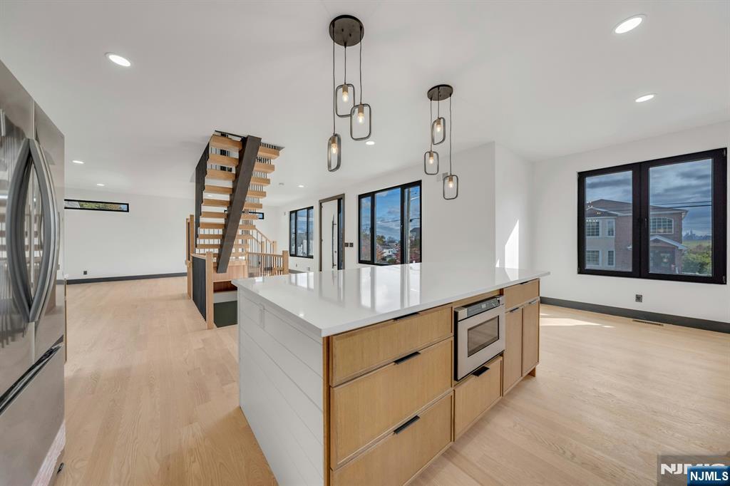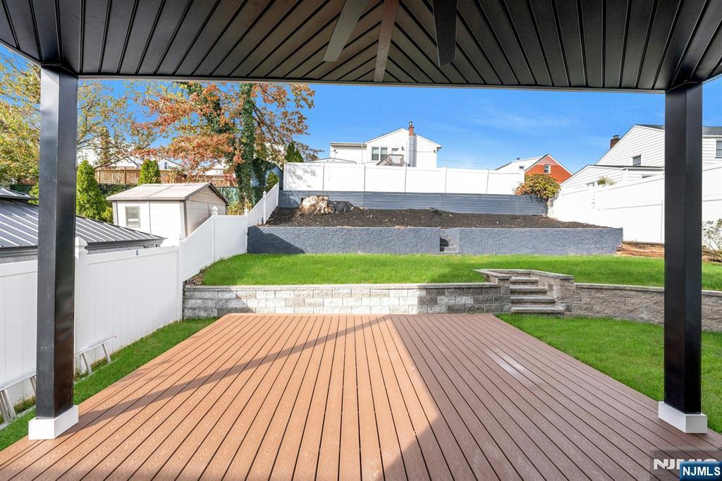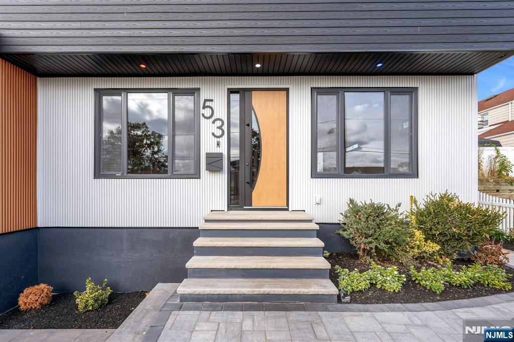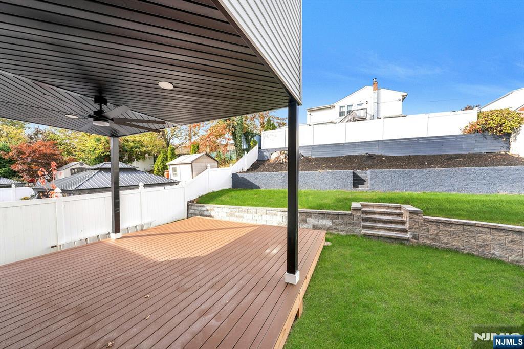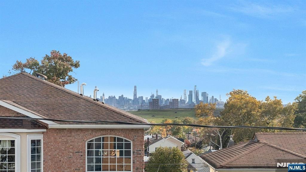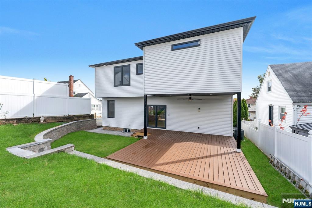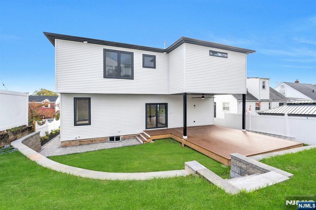 East-facing, newly constructed 4-bedroom, 3 full bath single-family over an existing foundation with a 1-car built-in garage. This open-concept colonial features a living room, dining room with French doors to the rear yard, a gourmet kitchen with stainless steel appliances, an island, quartz countertops, and a tiled backsplash, a pantry, and a half bathroom on the first floor. The 2nd floor has master bedrooms with a walk-in closet and a private full bath with a soaking tub, shower stall, and double vanity sinks, as well as a walk-out balcony with a NYC view! Also, 3 additional generously sized bedrooms, a full bath, and a laundry closet. Pull downstairs for additional storage in the attic. Fully finished basement with family room, full bathroom, utility closet, and access to 1 1-car built-in garage. Features include: Hardwood floors on 1st & 2nd level, tiled baths, LVT flooring in basement, European windows and exterior doors, all new plumbing, new 200 amp electric service, 2 gas forced hot air and central AC units, rough wiring for future cameras and high speed internet. Kitchen appliances include: Refrigerator with Ice maker, wine cooler, dishwasher, gas range, and built-in microwave. Fenced-in rear yard with a composite deck off the rear. 3 blocks to the NYC Bus Stop as well as the Bus to Hackensack/Newark.