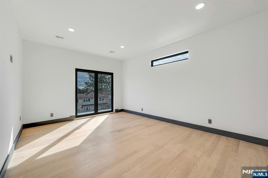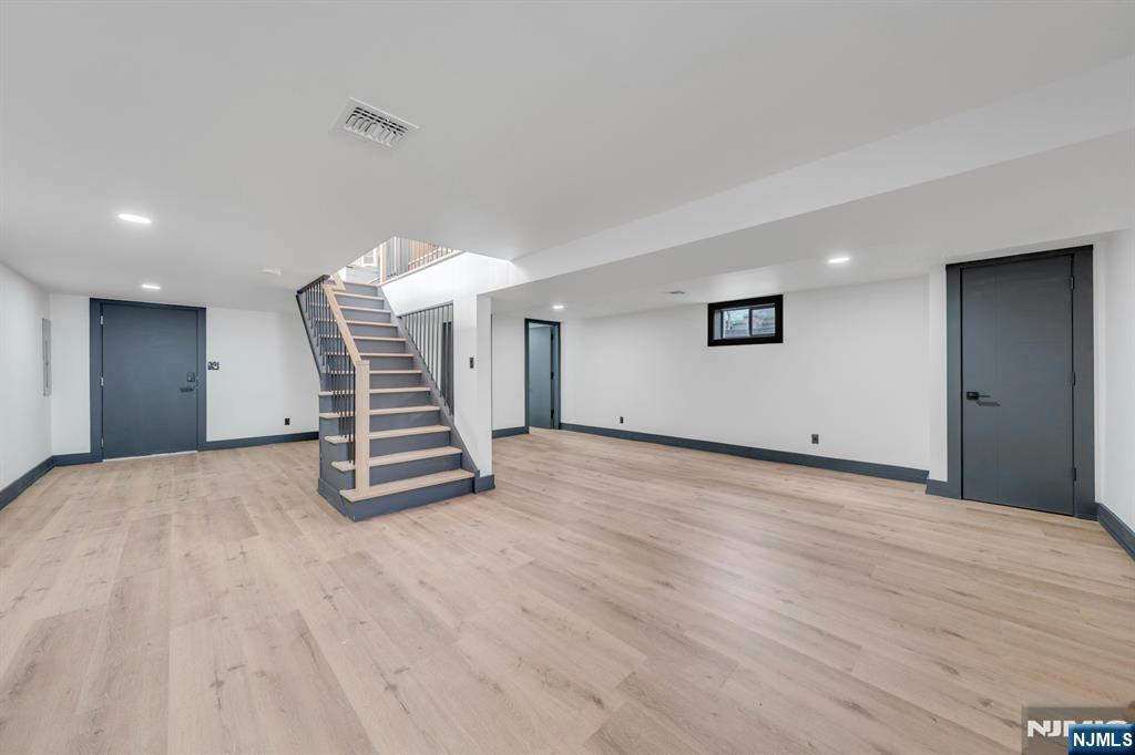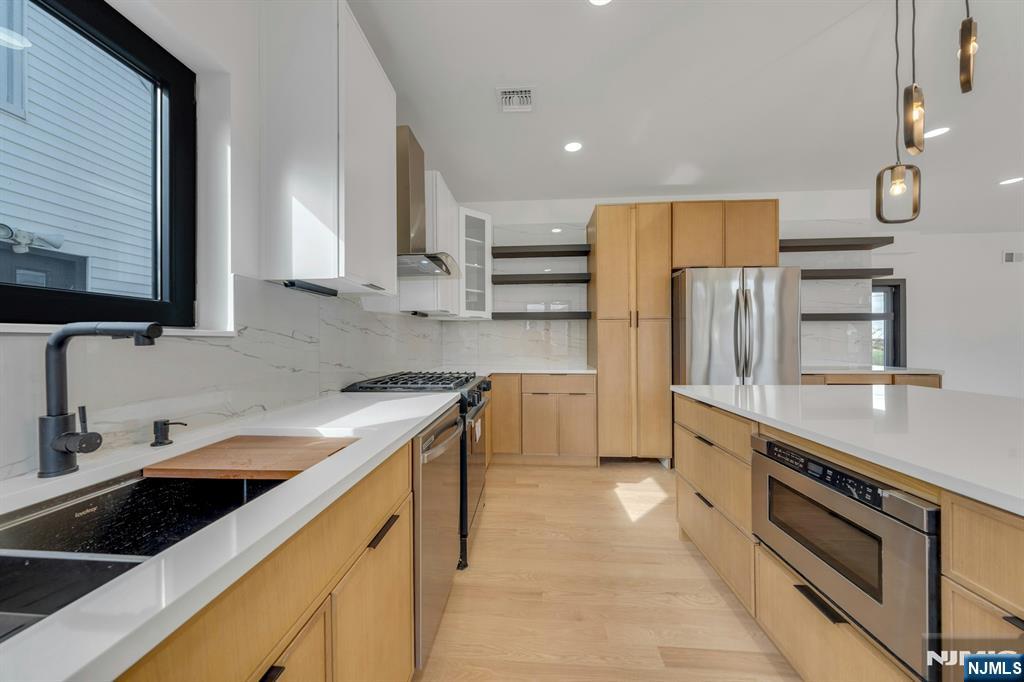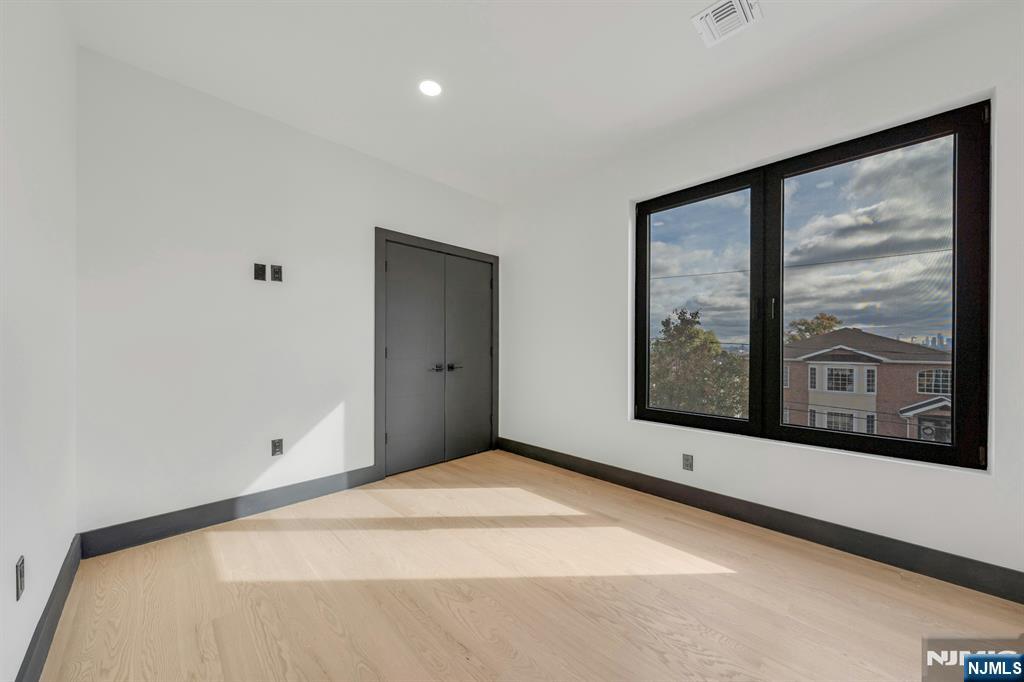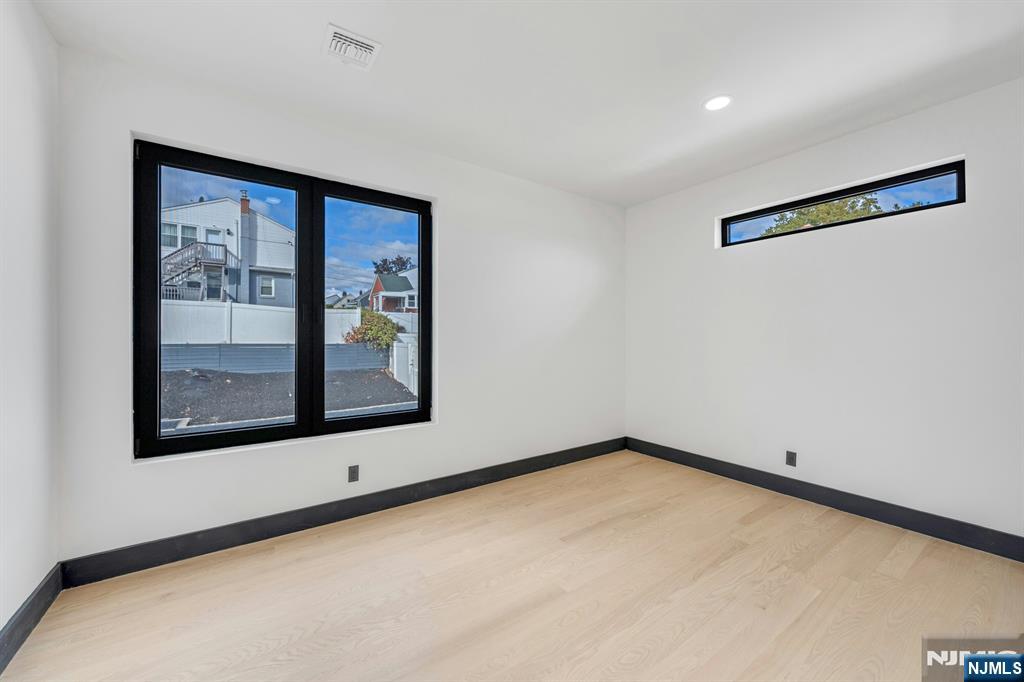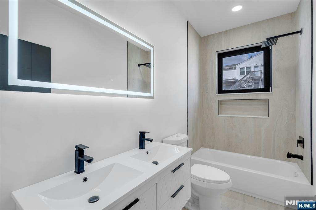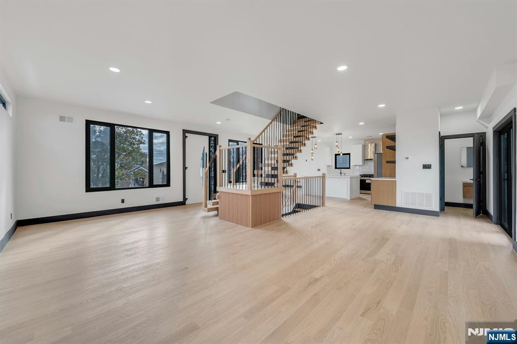 East-facing, newly constructed 4-bedroom, 3 full bath single-family over an existing foundation with a 1-car built-in garage. This open-concept colonial features a living room, dining room with French doors to the rear yard, a gourmet kitchen with stainless steel appliances, an island, quartz countertops, and a tiled backsplash, a pantry, and a half bathroom on the first floor. The 2nd floor has master bedrooms with a walk-in closet and a private full bath with a soaking tub, shower stall, and double vanity sinks, as well as a walk-out balcony with a NYC view! Also, 3 additional generously sized bedrooms, a full bath, and a laundry closet. Pull downstairs for additional storage in the attic. Fully finished basement with family room, full bathroom, utility closet, and access to 1 1-car built-in garage. Features include: Hardwood floors on 1st & 2nd level, tiled baths, LVT flooring in basement, European windows and exterior doors, all new plumbing, new 200 amp electric service, 2 gas forced hot air and central AC units, rough wiring for future cameras and high speed internet. Kitchen appliances include: Refrigerator with Ice maker, wine cooler, dishwasher, gas range, and built-in microwave. Fenced-in rear yard with a composite deck off the rear. 3 blocks to the NYC Bus Stop as well as the Bus to Hackensack/Newark.