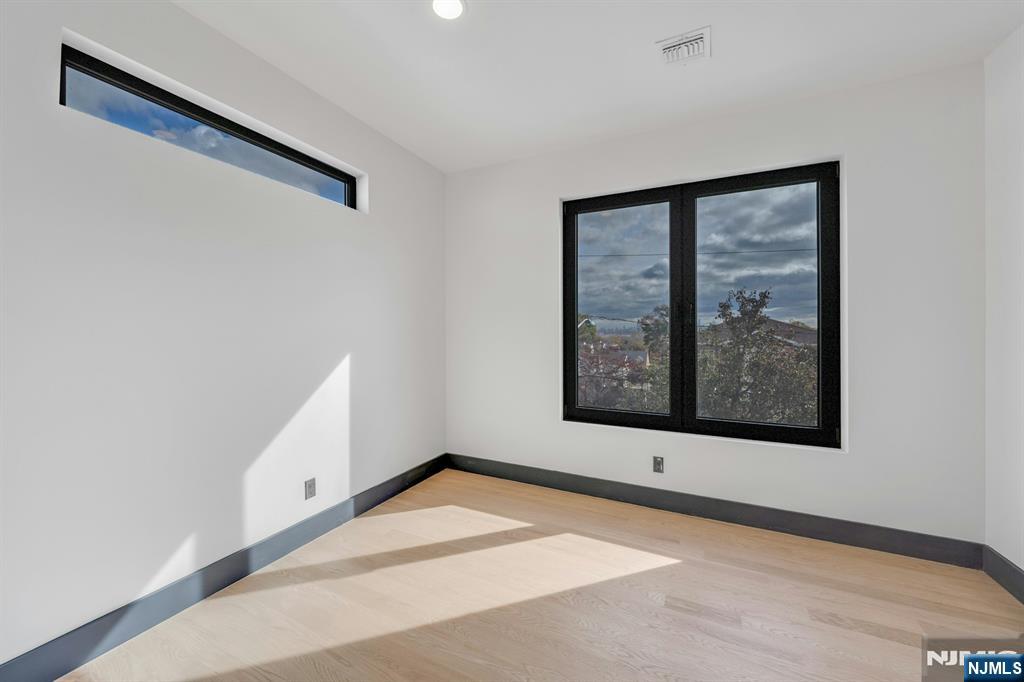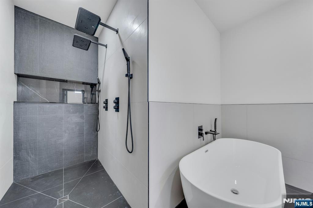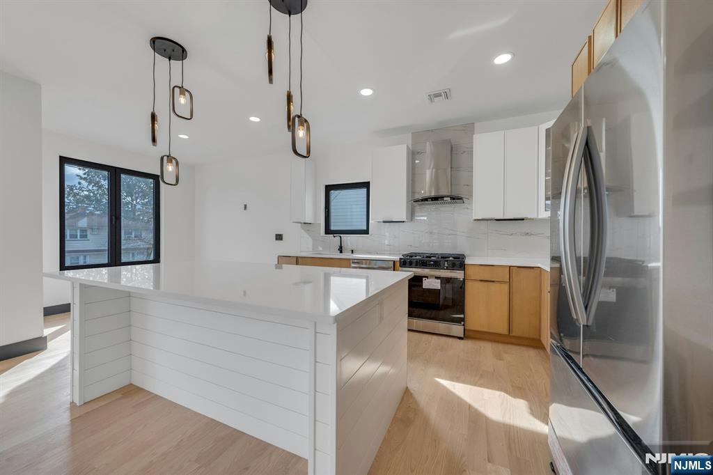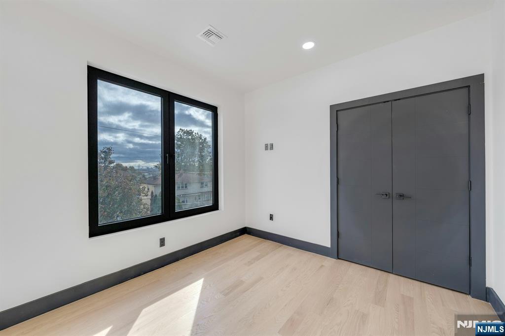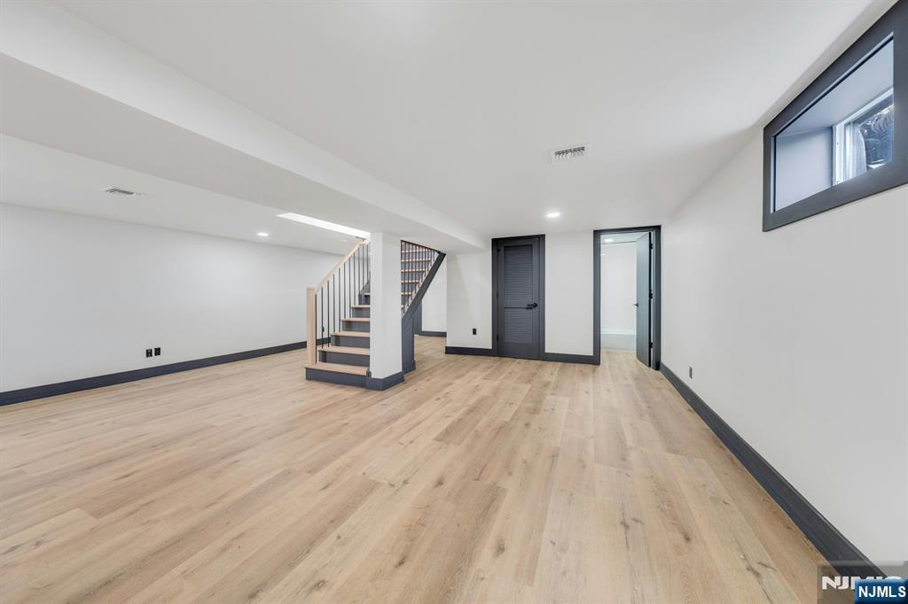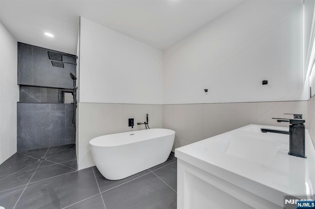 East-facing, newly constructed 4-bedroom, 3 full bath single-family over an existing foundation with a 1-car built-in garage. This open-concept colonial features a living room, dining room with French doors to the rear yard, a gourmet kitchen with stainless steel appliances, an island, quartz countertops, and a tiled backsplash, a pantry, and a half bathroom on the first floor. The 2nd floor has master bedrooms with a walk-in closet and a private full bath with a soaking tub, shower stall, and double vanity sinks, as well as a walk-out balcony with a NYC view! Also, 3 additional generously sized bedrooms, a full bath, and a laundry closet. Pull downstairs for additional storage in the attic. Fully finished basement with family room, full bathroom, utility closet, and access to 1 1-car built-in garage. Features include: Hardwood floors on 1st & 2nd level, tiled baths, LVT flooring in basement, European windows and exterior doors, all new plumbing, new 200 amp electric service, 2 gas forced hot air and central AC units, rough wiring for future cameras and high speed internet. Kitchen appliances include: Refrigerator with Ice maker, wine cooler, dishwasher, gas range, and built-in microwave. Fenced-in rear yard with a composite deck off the rear. 3 blocks to the NYC Bus Stop as well as the Bus to Hackensack/Newark.