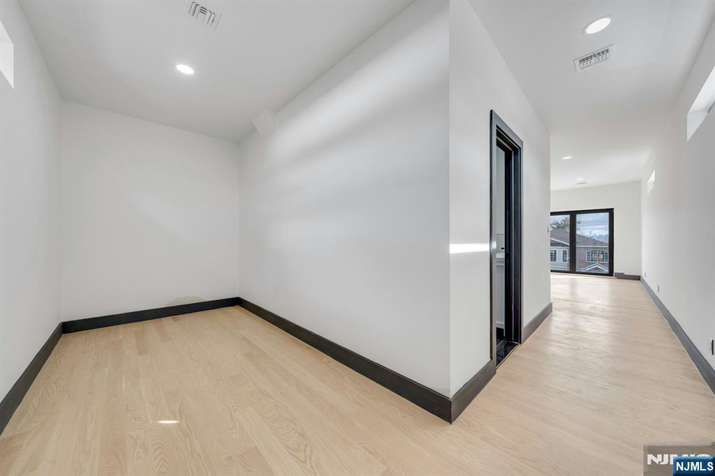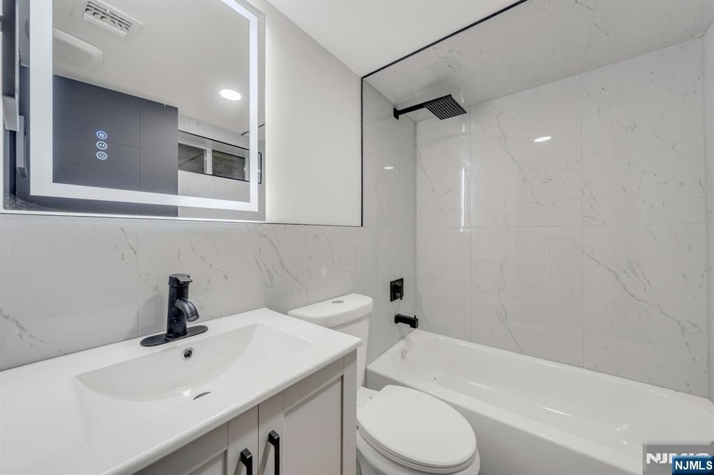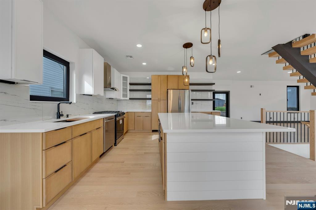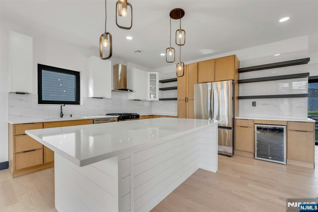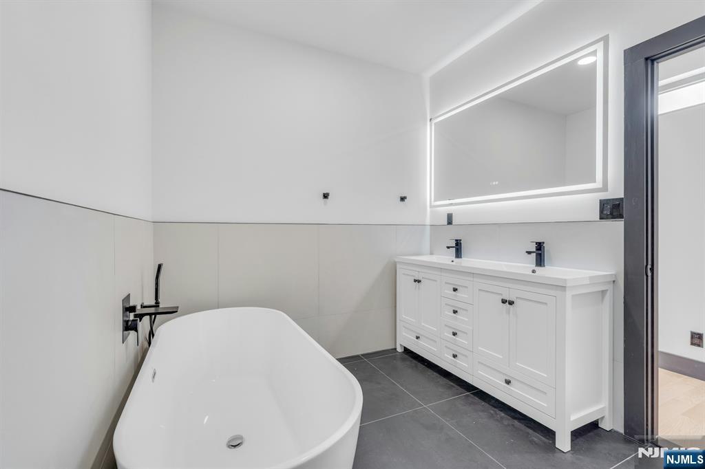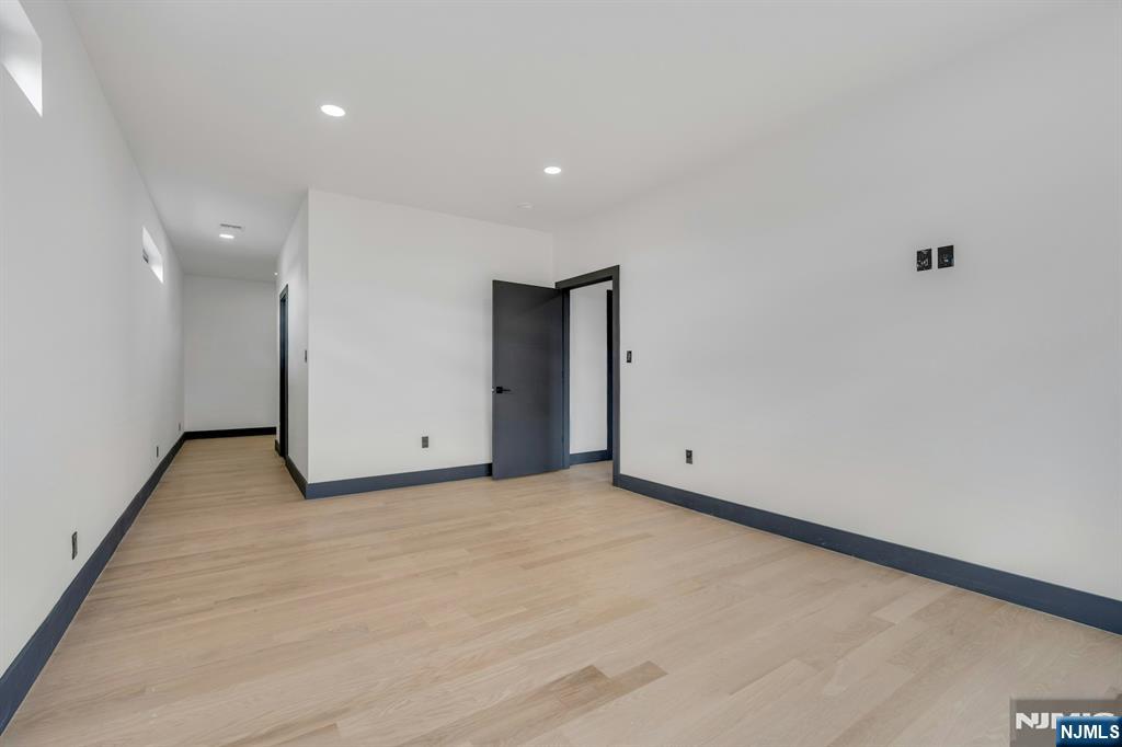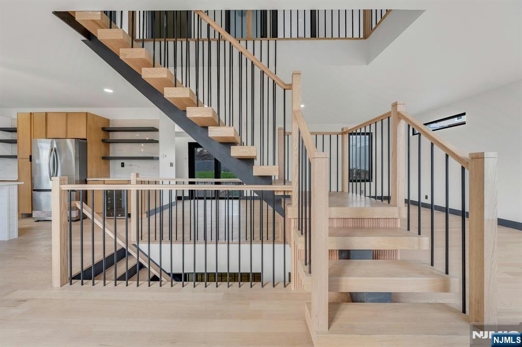 East-facing, newly constructed 4-bedroom, 3 full bath single-family over an existing foundation with a 1-car built-in garage. This open-concept colonial features a living room, dining room with French doors to the rear yard, a gourmet kitchen with stainless steel appliances, an island, quartz countertops, and a tiled backsplash, a pantry, and a half bathroom on the first floor. The 2nd floor has master bedrooms with a walk-in closet and a private full bath with a soaking tub, shower stall, and double vanity sinks, as well as a walk-out balcony with a NYC view! Also, 3 additional generously sized bedrooms, a full bath, and a laundry closet. Pull downstairs for additional storage in the attic. Fully finished basement with family room, full bathroom, utility closet, and access to 1 1-car built-in garage. Features include: Hardwood floors on 1st & 2nd level, tiled baths, LVT flooring in basement, European windows and exterior doors, all new plumbing, new 200 amp electric service, 2 gas forced hot air and central AC units, rough wiring for future cameras and high speed internet. Kitchen appliances include: Refrigerator with Ice maker, wine cooler, dishwasher, gas range, and built-in microwave. Fenced-in rear yard with a composite deck off the rear. 3 blocks to the NYC Bus Stop as well as the Bus to Hackensack/Newark.
