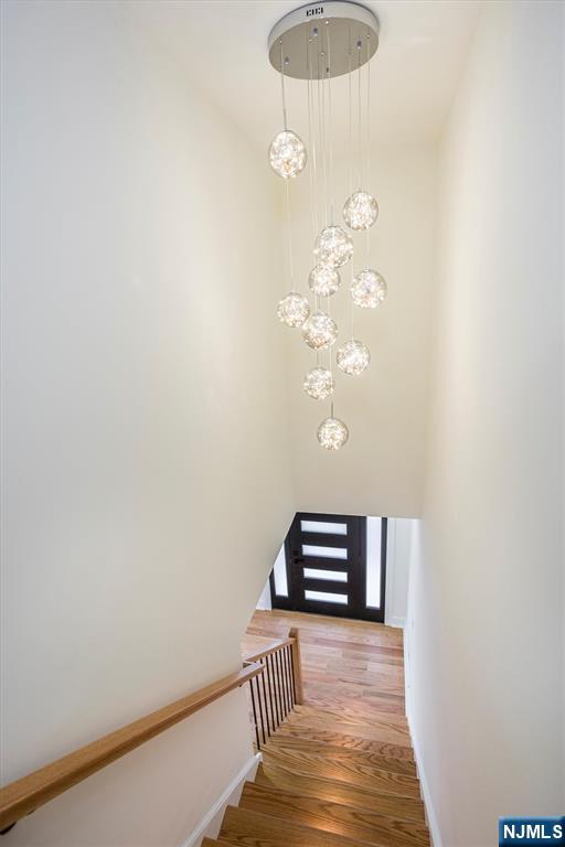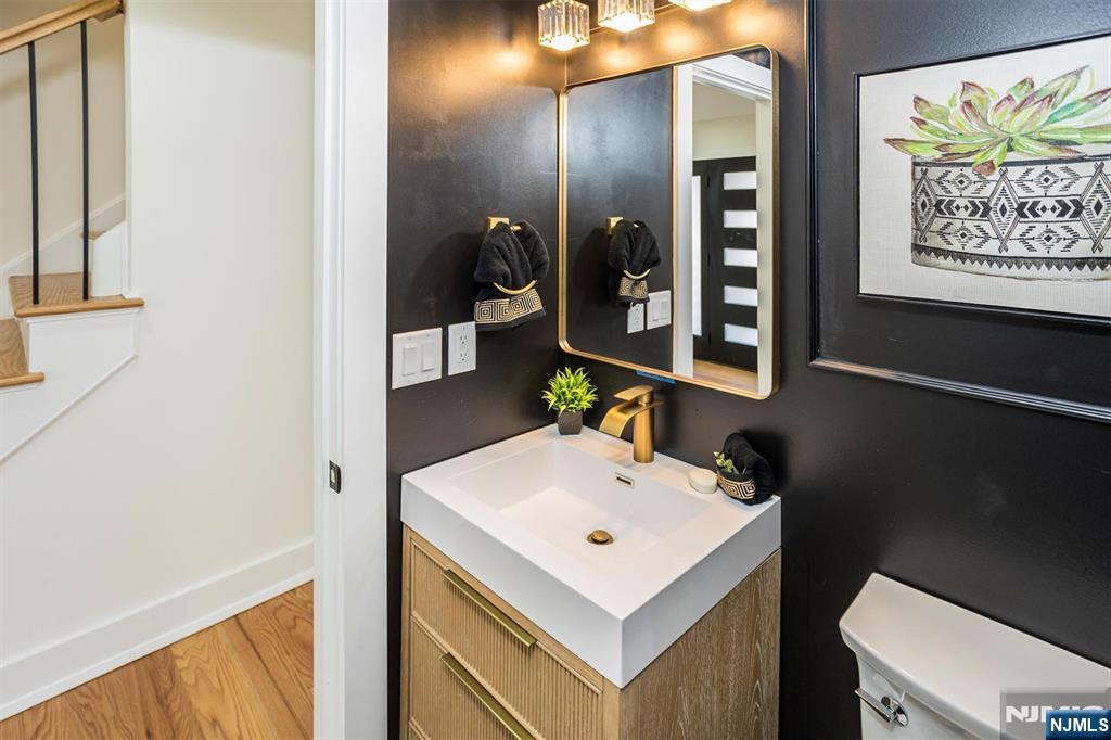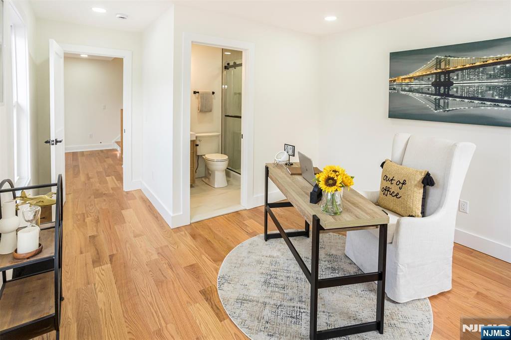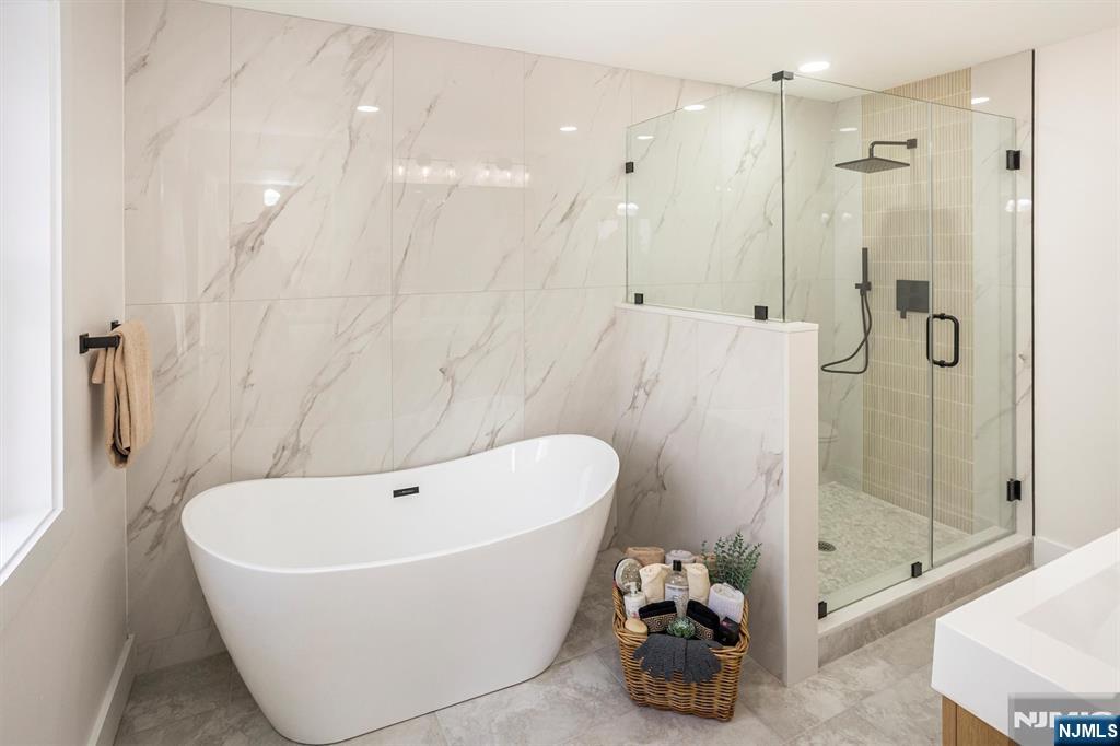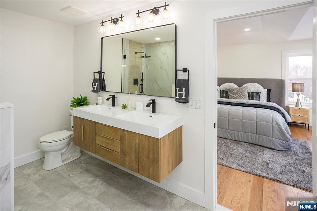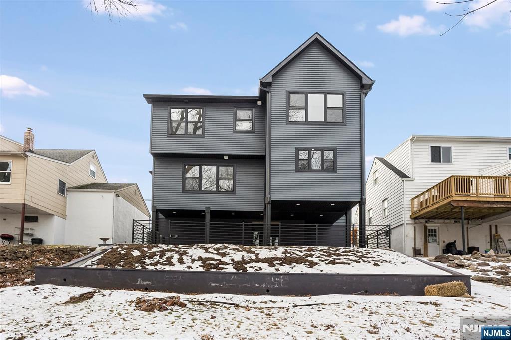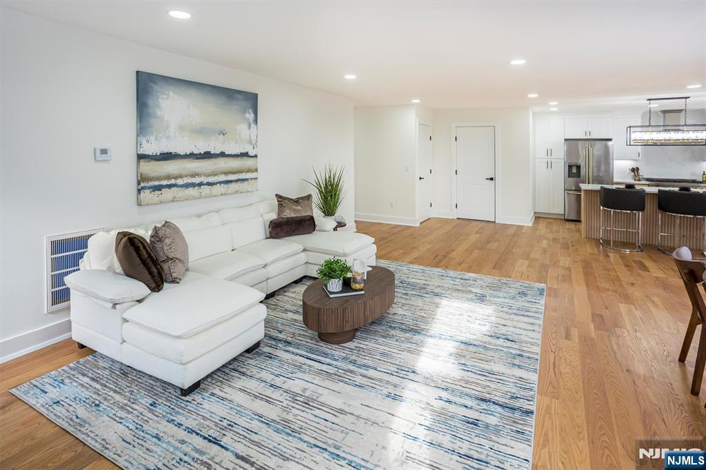 This spectacularly expanded residence has been meticulously renovated with exceptional attention to detail throughout. The modern open-concept floor plan is highlighted by beautiful oak floors, abundant natural light, and a seamless connection between the spacious living and dining areas. The expansive kitchen overlooks the main living space and features a sleek modern electric fireplace, creating a warm yet contemporary ambiance. A well-appointed first-floor bedroom with a private en-suite bath offers flexibility for guests or multi-generational living, complemented by an elegant powder room on the main level. The second floor is anchored by a generously sized primary suite showcasing winter skyline views of New York City and a luxurious spa-inspired bath with a soaking tub and oversized glass-enclosed shower. Three additional well-proportioned bedrooms and a stunning hall bath complete this level. The lower level offers a large family or recreation room, utility space, and walkout access to a beautifully designed, mostly covered patio overlooking the yard. Truly move-in ready, this home reflects thoughtful craftsmanship and refined finishes at every turn.